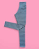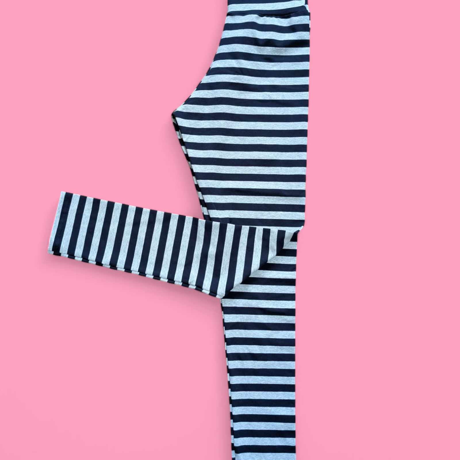 Super comfy leggings with new wider waistband in the last of our navy and marle grey stripe fabric.
